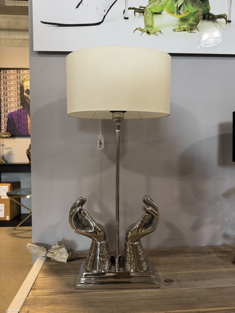 Tischlampe Hände, Tischleuchte Silber-weiß, Tischlampe mit Lampenschirm oval, Höhe 65 cm