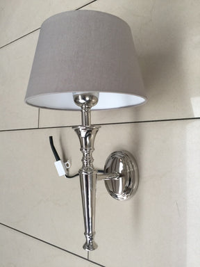Wandleuchte verchromt Lampenschirm grau-taupe, Wandlampe silber mit Lampenschirm Landhausstil
