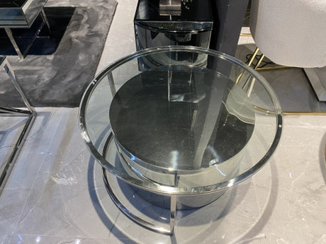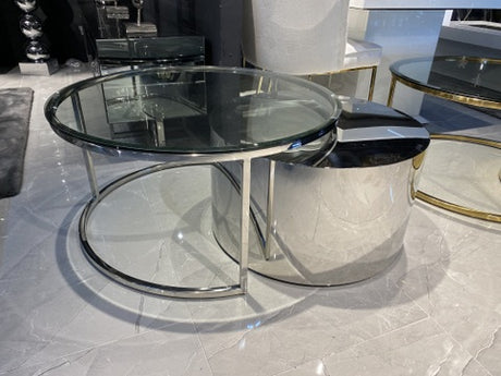 Couchtisch Silber, 2er Set runder Couchtisch verchromt, Glastisch rund, Durchmesser 90 cm