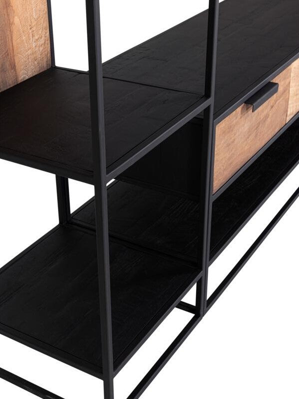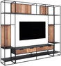 Wohnzimmerschrank schwarz-Naturholz, Wandregal Metall Naturholz-Farbe, Wohnzimmerregal mit Schubladen, Breite 260 cm