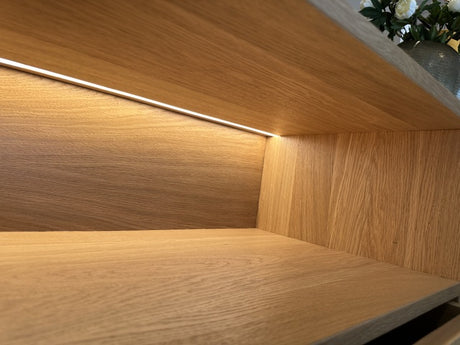 TV Schrank mit LED-Beleuchtung Naturholz-Farbe, Fernsehschrank LED-Beleuchtung Holz, Breite 200 cm