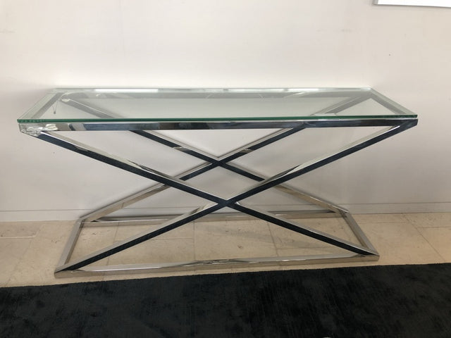 Konsole verchromt Glas-Metall, Sideboard mit Glasplatte, Wandtisch verchromt Glas, Maße 150x40 cm