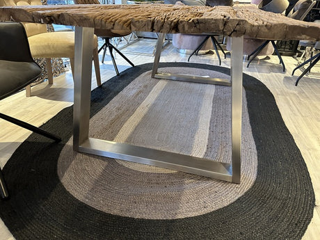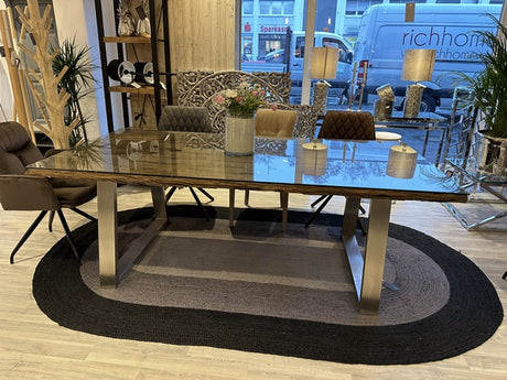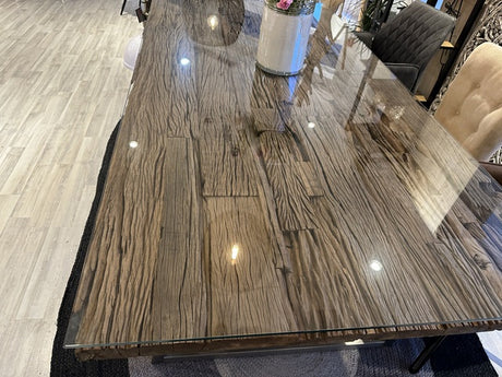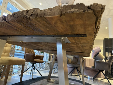Esstisch Altholz, Tisch Glasplatte, Esstisch Edelstahl Tischbeine, Breite 220 cm