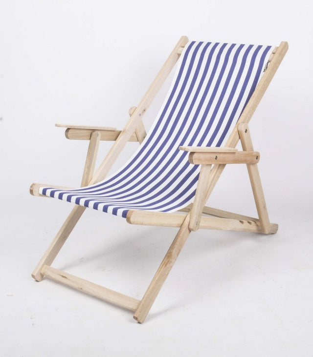 Liegestuhl aus Massivholz und 100 % Baumwolle, Strandstuhl gestreift blau-weiß