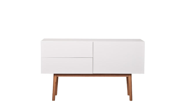 Das Sideboard enthält eine Tür und zwei Schubladen.