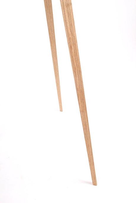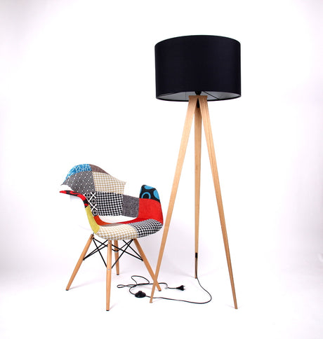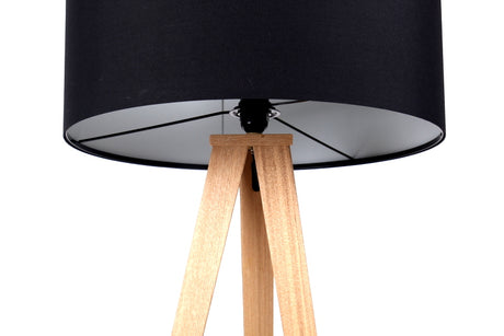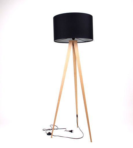 Moderne Dreifuß Stehleuchte in Holzoptik mit einem Lampenschirm in zwei Farben: schwarz und weiß