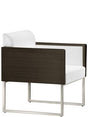 Der Stuhl-Sessel ist seitlich mit massiv Sandwichplatte aus Eiche bestückt. Rückenlehne und Seiten von innen gepolstert. Gestell aus viereckigem Stahlrohr 20x20 mm.