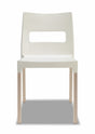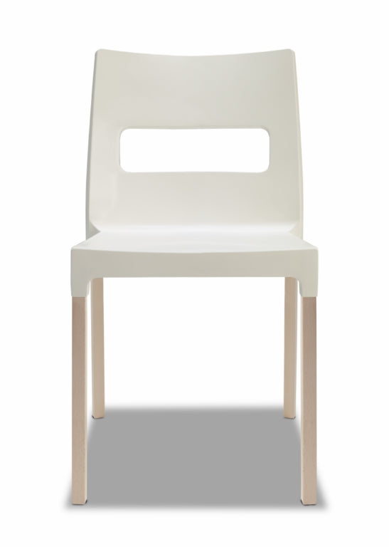 Design Stuhl, mit einer perfekten Kombination aus Kunststoff und klassischem Holz, die für einen hohen esthätischen Wert sorgen. Der Stuhl ist hervorragend für den Innenbereich geeignet. Den Sitz gibt es in drei verschiedenen Farben: zwei grau Töne und Leinen, auch mit dunklem Holzgestell