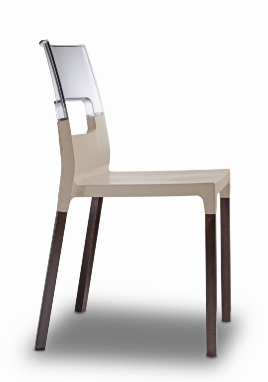 Design Stuhl, mit einer perfekten Kombination aus Kunststoff und klassischem Holz, die für einen hohen esthätischen Wert sorgen. Der Stuhl ist hervorragend für den Innenbereich geeignet und stapelbar. Den Sitz gibt es in vier verschiedenen Farben.