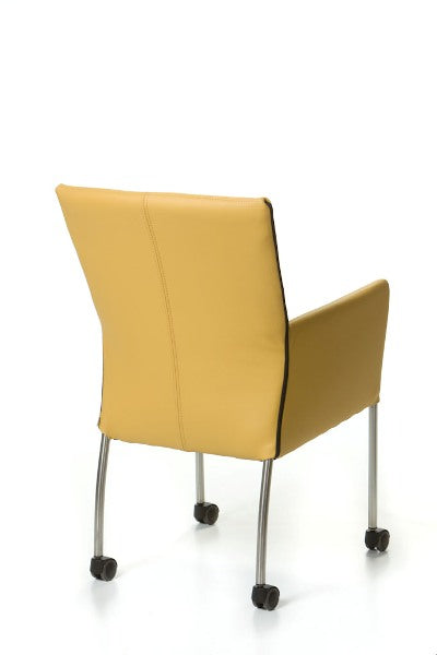 Den Stuhl kann man auch ohne Rollen bestellen. Die Farbe des Bezugs ist wählbar.