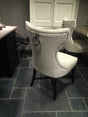 Stuhl leinen-weiß, Stuhl mit einem Metallring am der Rückenlehne
