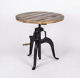 Die massive Platte besteht bei diesem Bartisch/ Esstisch  aus Schiffsplanken aus Akazienholz, das Gestell aus Schmiedeeisen ist höhenverstellbar mit einer klassischer Kurbel.