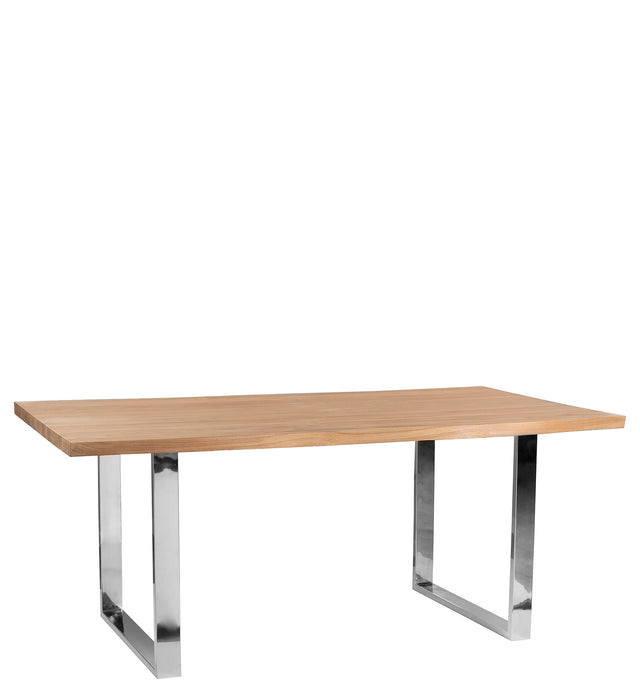 Die naturbelassene, geschwungene Form der Vollholz-Tischplatte steht in einem spannungsvollen Kontrast zu den in den Fußfronten eingelassenen Details aus hochwertigem Edelstahl.
