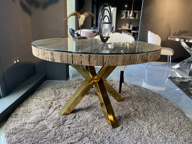 Esstisch rund Silber Tischgestell, runder Tisch Altholz Tischplatte, Durchmesser 130 cm - Gold ist auf Lager und wird versandt, sobald es wieder verfügbar ist