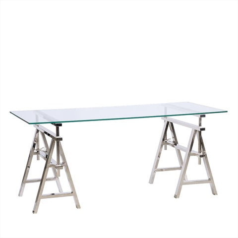 Höhenverstellbarer Schreibtisch Glas-Metall, Schreibtisch Silber, Glastisch Silber Gestell, Länge 190 cm