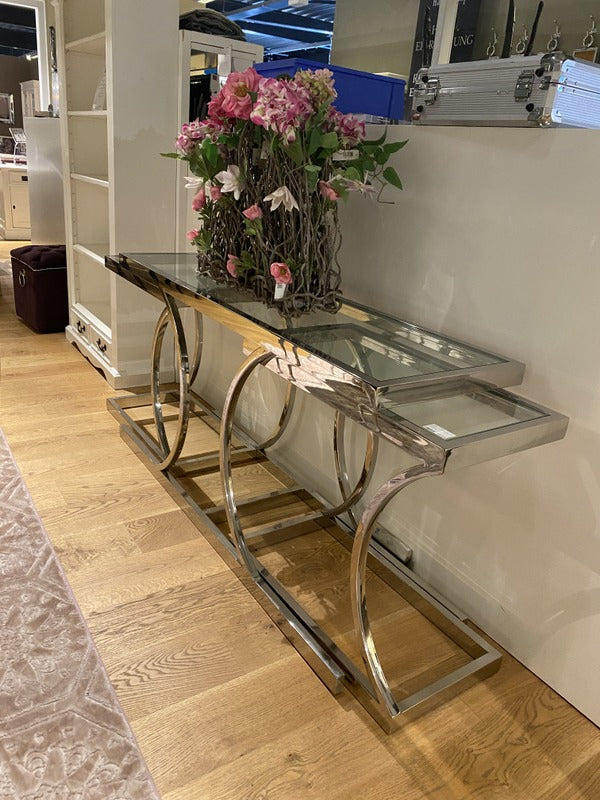 Konsole Silber, Wandtisch verchromt, Glas-Konsole Silber, Breite 150 cm