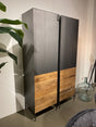 Schrank links Metall Holz, Bücherschrank Holz, Schrank mit drei Schubladen, Breite 55 cm
