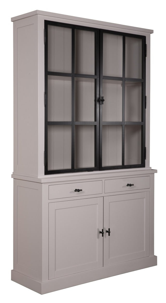 Ein Geschirrschrank im Landhausstil. Die Metall-Türen gibt sind immer in Farbe schwarz.