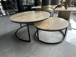 Couchtisch Travertinstein Tischplatte, Couchtisch rund Travertin, 2er Set, Maße 68-90 cm
