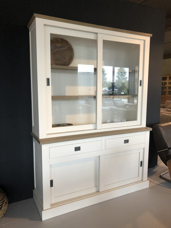 Vitrine weiß Massivholz Eiche, Geschirrschrank weiß-braun Landhaus, Breite 160 cm