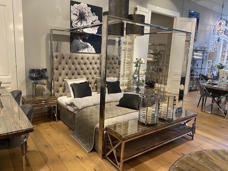 Bett taupe gepolstert, Himmelbett verchromtes Gestell, Breite 200 cm