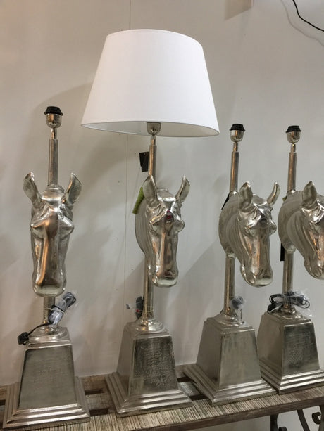 Tischleuchte Pferd mit Lampenschirm weiß, Stehlampe silber mit weißen Lampenschirm