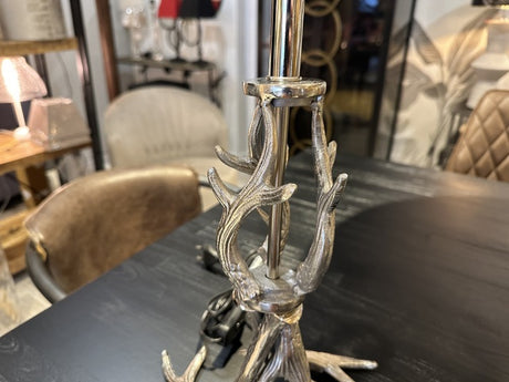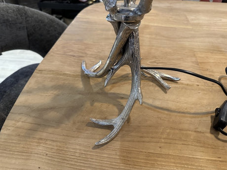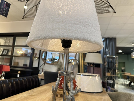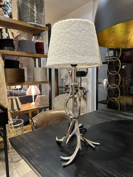 Tischlampe Geweih Silber mit Lampenschirm weiß, Tischleuchte Silber weißer Lampenschirm